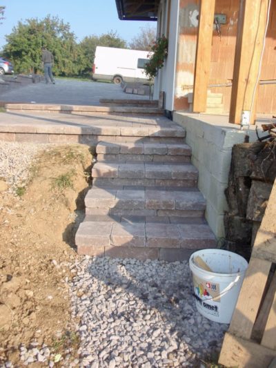 Nutnosťou realizácie bolo zabezpečenie správneho odvedenia vody z hlavnej cesty vyspádovanej v smere k domu. Ohraničenie pozemku nemalo tvoriť skutočné oplotenie. Na tento účel boli použité tvárnice Semmelrock/Castello Antico, ktoré rozmermi mierne prevyšovali výšku skutočného terénu cesty. Platne v danom prípade tvoria, okrem krycej funkcie na oporných múroch, tiež funkciu obrubníkov, a zároveň je z nich vytvorená ako terasa pred vstupom do domu, tak aj schodové prvky.